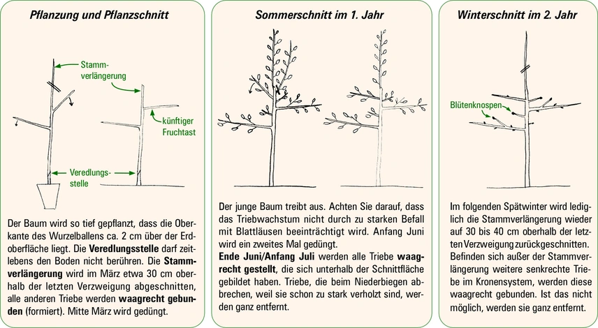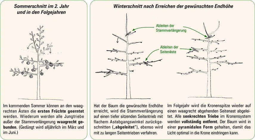 Untenstehend wird die Erziehung einer Spindelkrone erläutert. Die beschriebene Erziehungsform ist möglich für Apfel, Birne, Süßkirsche, Zwetsche, Mirabelle, Reneklode und Aprikose. Sauerkirsche und Pfirsich können zwar auch als Spindel erzogen werden, diese beiden Obstarten benötigen aber im Gegensatz zu den zuvor genannten einen jährlichen starken Rückschnitt der einjährigen Triebe. Sie bedürfen daher einer anderen als der geschilderten Kronenerziehung. Lesen Sie mehr dazu hier: Pfirsich- und Sauerkirschschnitt