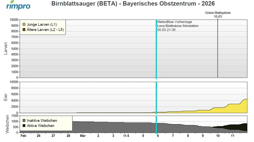 Obstbauern nutzen die heutzutage verfügbare Technik, um Informationen über den Entwicklungsstand von Krankheiten und Schädlingen zu gewinnen. Das Bayerische Obstzentrum verfügt über eigene Wetterstationen in den Obstanlagen. Mithilfe dieser Daten und der Spezialsoftware RimPro läasst sich simulieren, wann der Birnblattsauger mit der Eiablage beginnt. Das ist, wie aus obiger Graphik zu entnehmen ist, in diesen Tagen der Fall. Die Eiablage wird rasch zunehmen. Deswegen ist es so wichtig, jetzt einen Belag mit dem Tonmineral Kaolin (Porzellanerde) auf den Trieben ausgebracht zu haben. Das können Sie auch im Hausgarten tun. Mehr Infos dazu finden Sie hier.