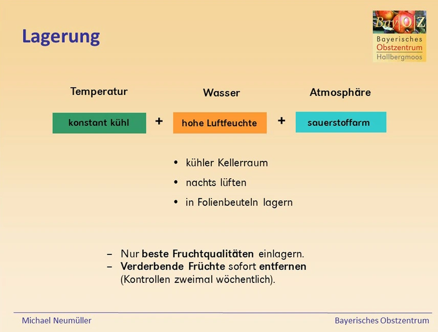 - Ernten Sie die Früchte schonend, es darf keine Verletzungen der Fruchtoberfläche und keine Druckstellen geben. Alle Früchte, die vom Baum zu Boden gefallen sind, können nicht eingelagert werden.
