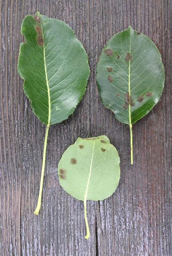 Das Bild zeigt die Symptome auf Blättern von Birnbäumen mit den typischen Symptomen. Auch Birnbäume werden befallen, mitunter auch mit einer speziell an die Birnen angepassten Art des Schorfpilzes (Birnenschorf).