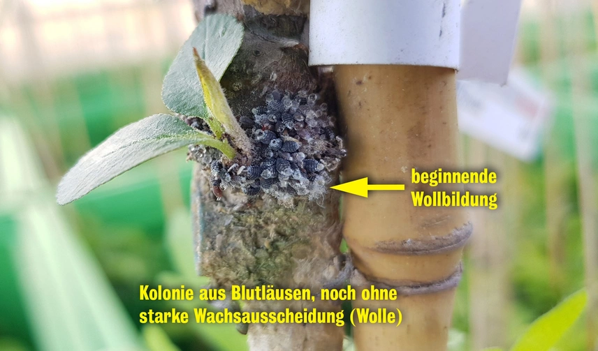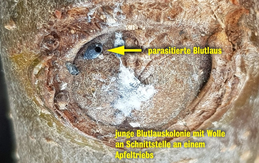 Die Apfelblutlaus fühlt sich immer wohler in unseren Klimaten. Sie hat einen natürlichen Gegenspieler, die Blutlauszehrwespe. Diese filigrane Wespe (die gar nicht aussieht wie unsere herkömmliche Wespe, sondern schwärzlich ist, viel kleiner uns sehr filigran gebaut) legt Eier in lebende Blutläuse ab. Darin wachsen dann die Larven der Zehrwespe heran, während die Blutlaus selbst langsam abstirbt. Aus dem ausgezehrten und vertrockneten Hinterleib der parasitierten Blutlaus schlüpft schließlich die erwachsende Blutlauszehrwespe. Nun ja, so funktioniert das ökologische Gleichgewicht der Natur. Das wäre also alles perfekt, wäre die Blutlauszehrwespe nicht so langsam in ihrer Entwicklung und nicht so empfindlich: Auch tritt sie natürlicherweise erst im Sommer so zahlreich auf, dass sie die Blutlaus in einigermaßen relevantem Ausmaß parasitieren kann. Zusätzlich reagiert sie sehr empfindlich auf alle Pflanzenschutzmaßnahmen. Es kann also vorkommen, dass wir Gärtner ein bisschen unterstützend eingreifen müssen.
