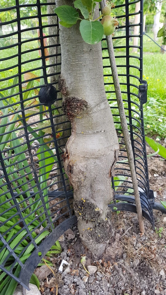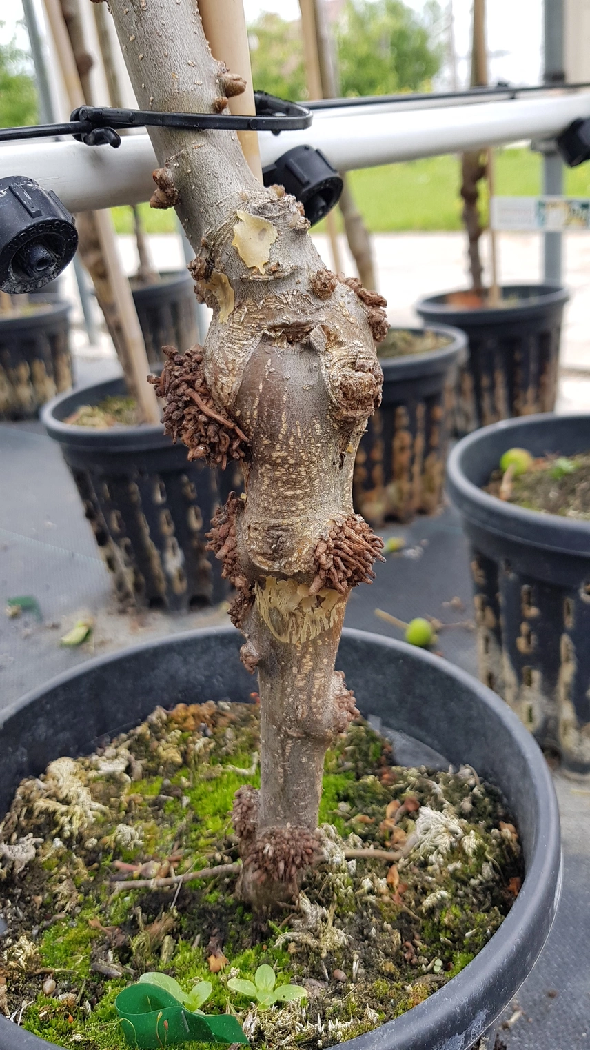 Die meist knubbelförmigen Ausbuchtungen mit manchmal kurzen, mitunter auch etwas längeren „fadenartigen“ Auswüchsen sind nichts anderes als Stellen des Sprosses, an denen er versucht, neue Wurzeln zu bilden. Da sie aber nicht unterhalb der Bodenoberfläche liegen, vertrocknen die Wurzeln mit der Zeit. Meist liegen diese Stellen unterhalb der Veredlungsstelle, gelegentlich finden sich auch darüber ein paar. Das ist völlig normal. Sie brauchen nichts zu unternehmen.